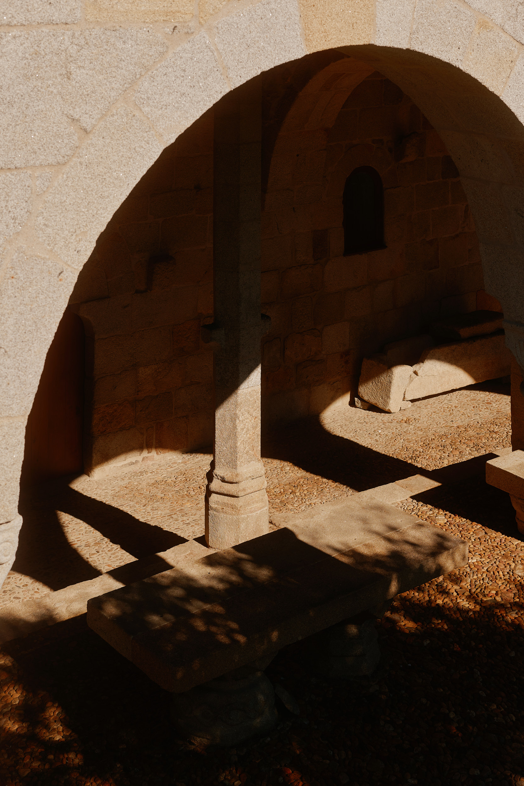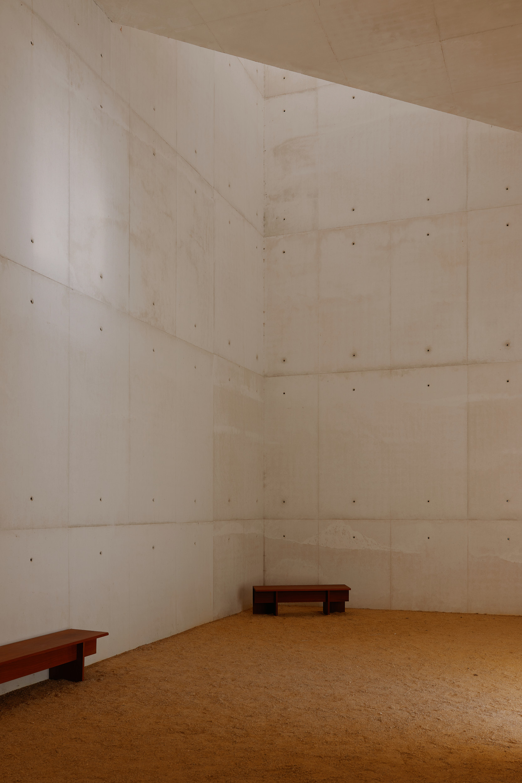 Two vertical volumes define an open courtyard paved in stabilised gravel, creating a moment of stillness between the new architecture and the historic stone walls. The design is stripped to essentials: smooth concrete surfaces, permeable textures, and a refined choreography of light and shadow establish a contemplative atmosphere. Each junction, line and opening is considered, producing an architecture of clarity and measure.