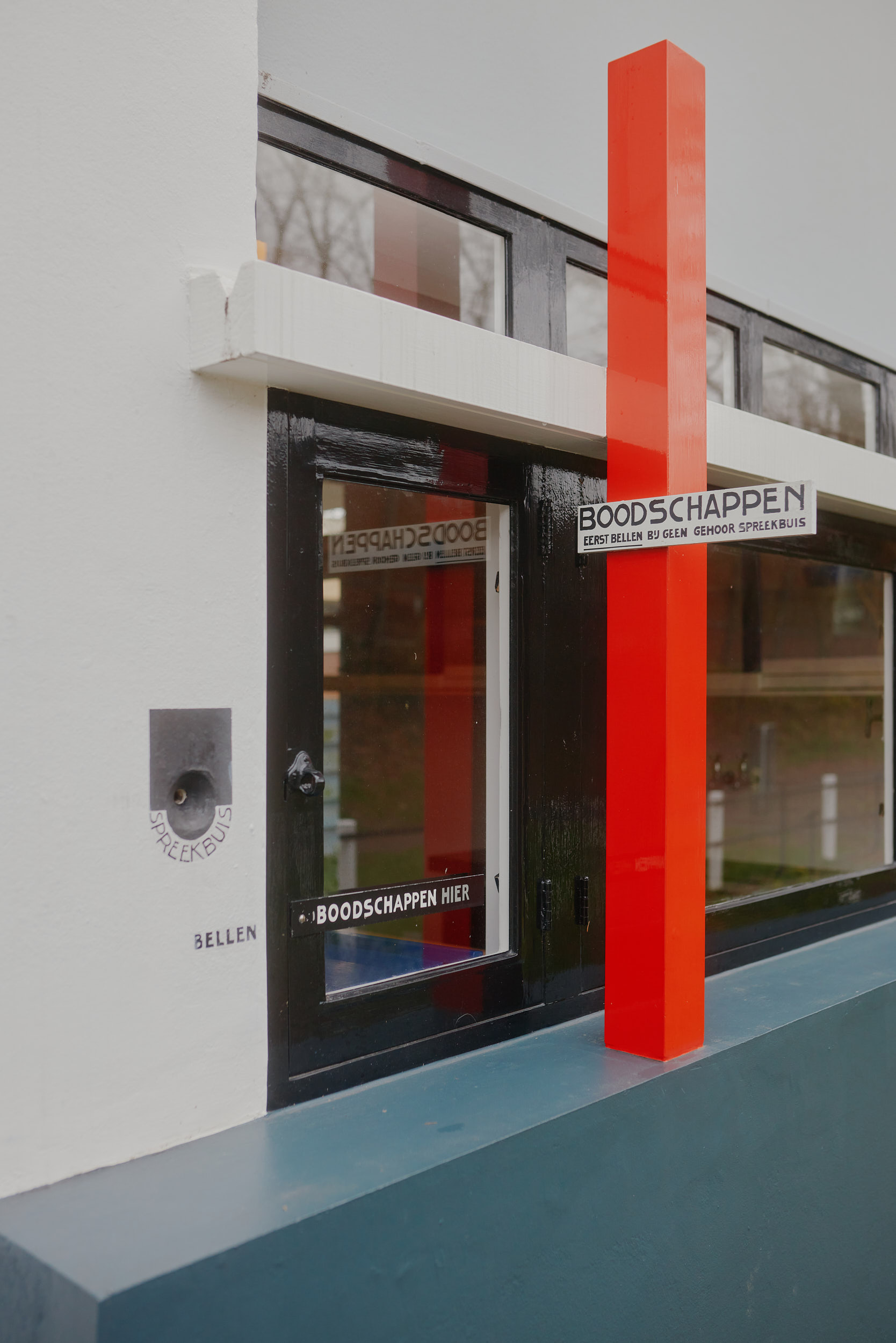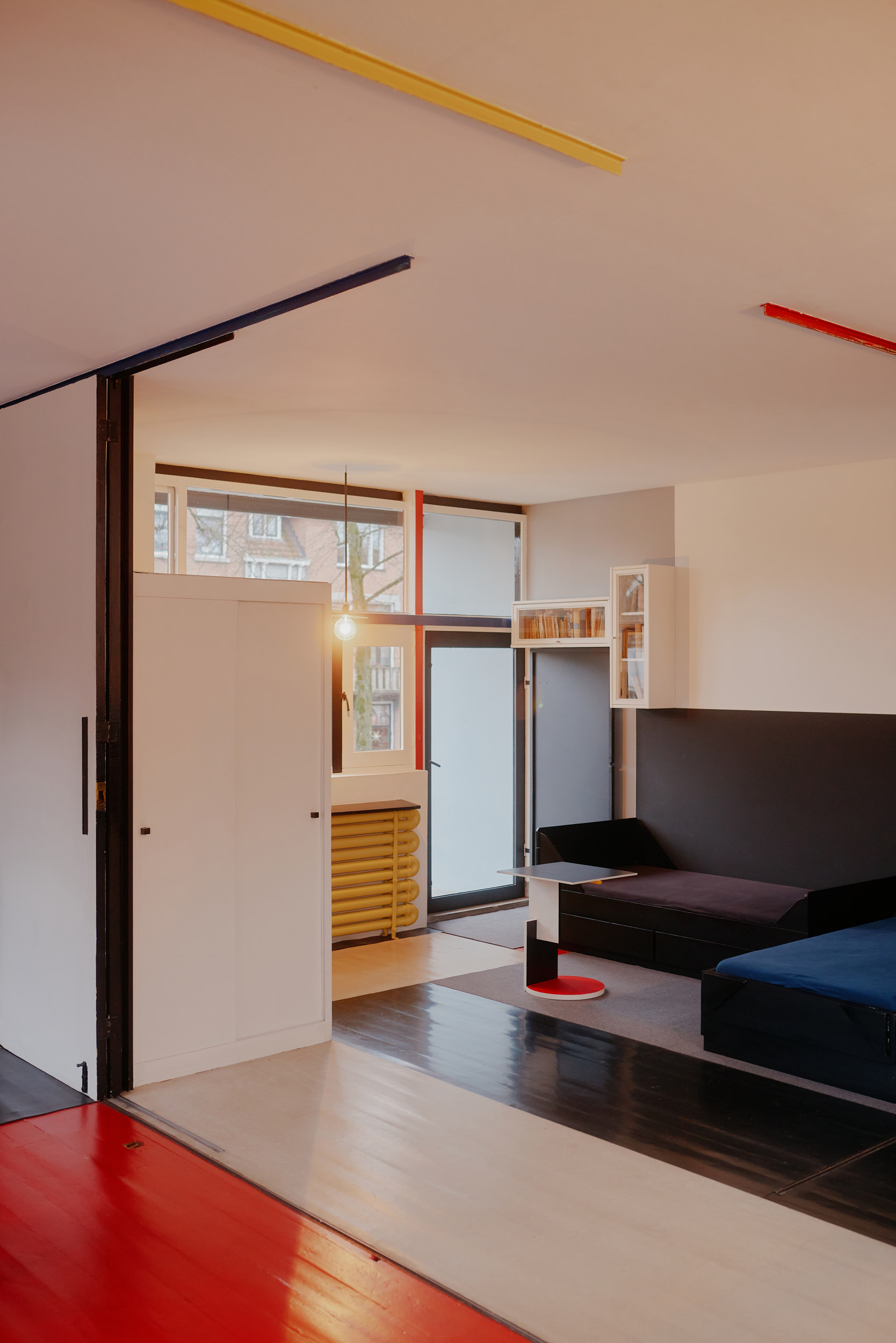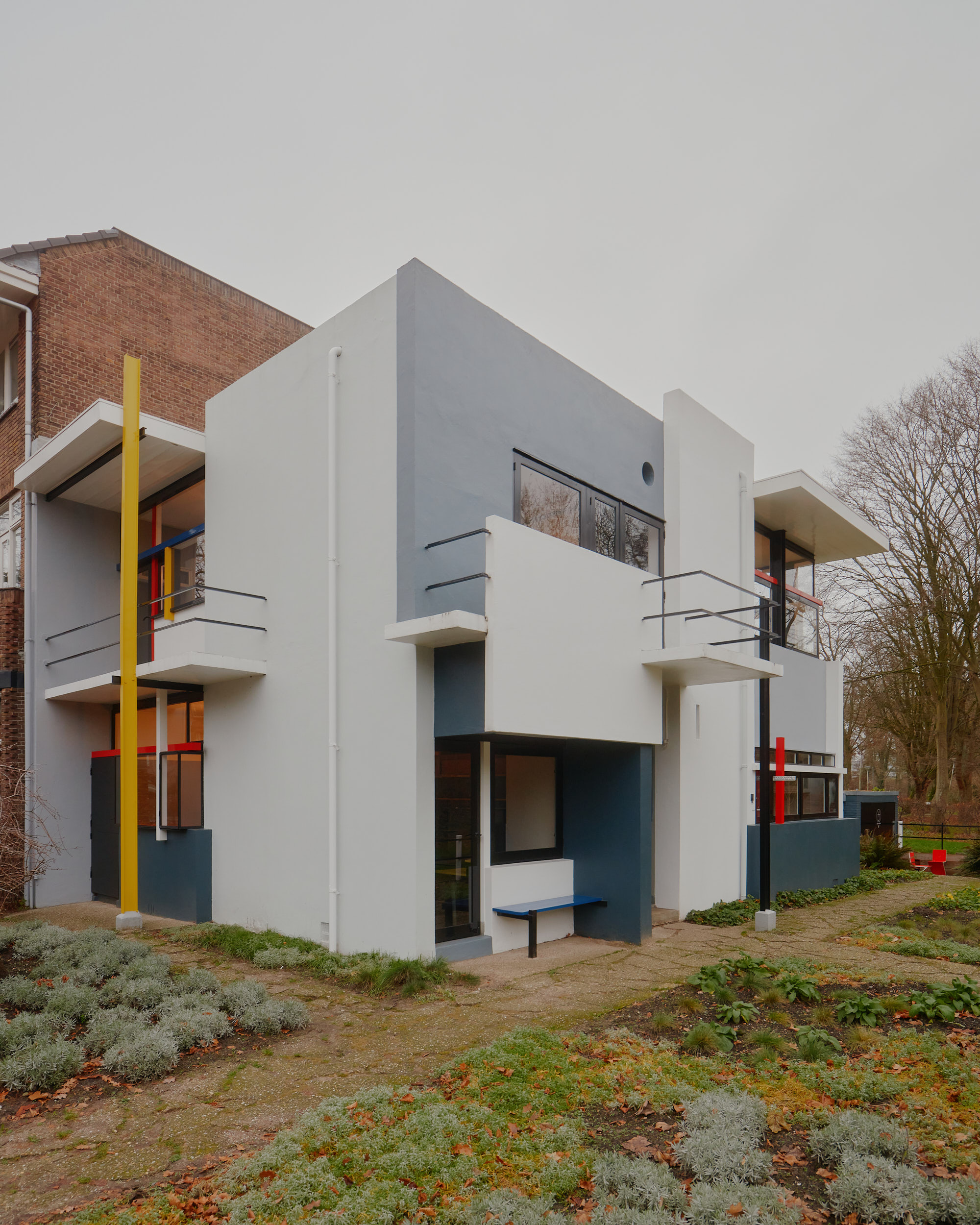 The design follows the strict geometric principles of De Stijl, characterized by asymmetry, clean lines, and a distinctive color palette of red, blue, yellow, black, white, and gray. The house also emphasizes a fluid connection between interior and exterior, challenging conventional spatial boundaries.